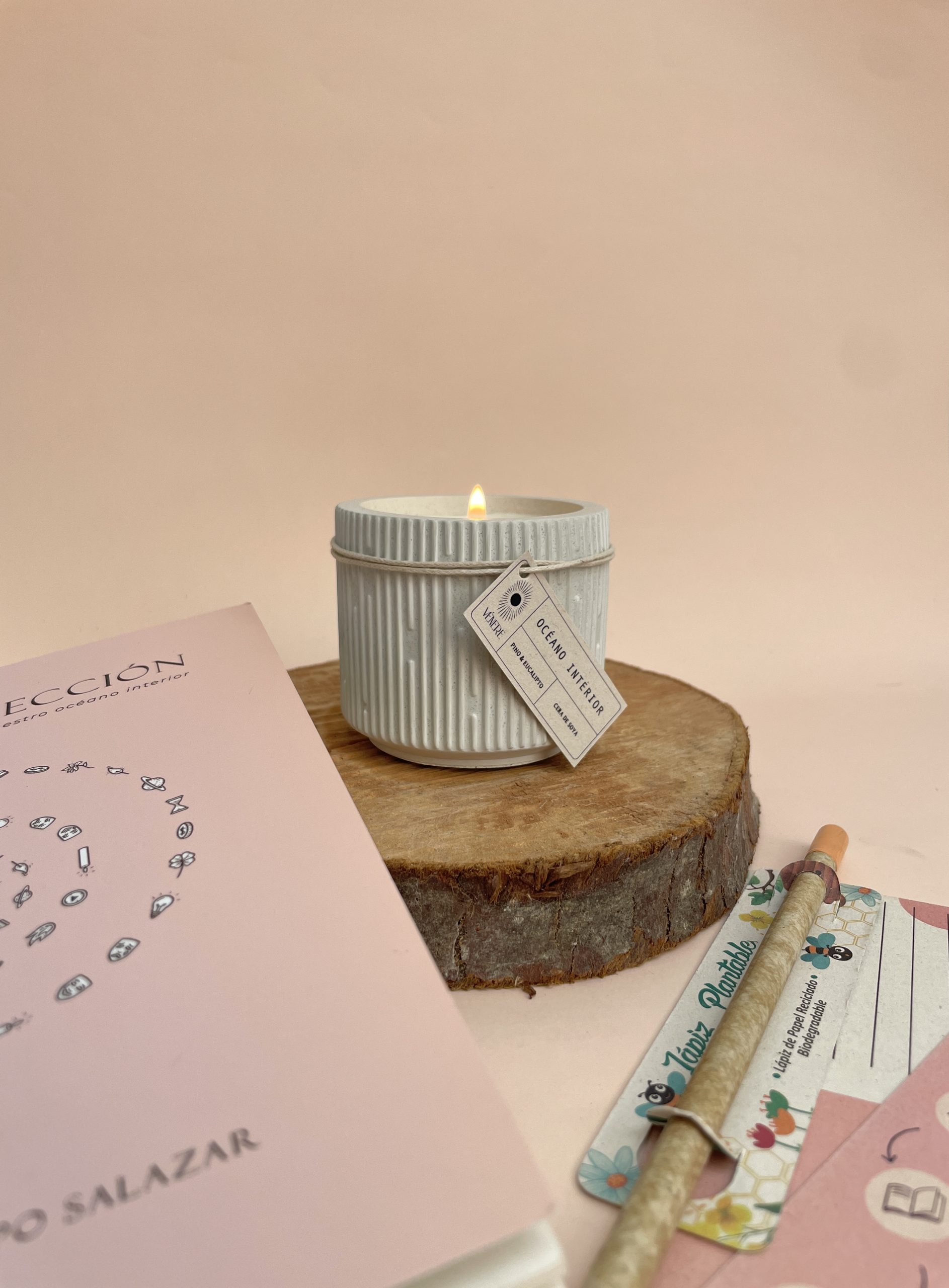 Una vela de cera de soya con aroma a pino y eucalipto, simbolizando la luz en tu viaje de introspección.